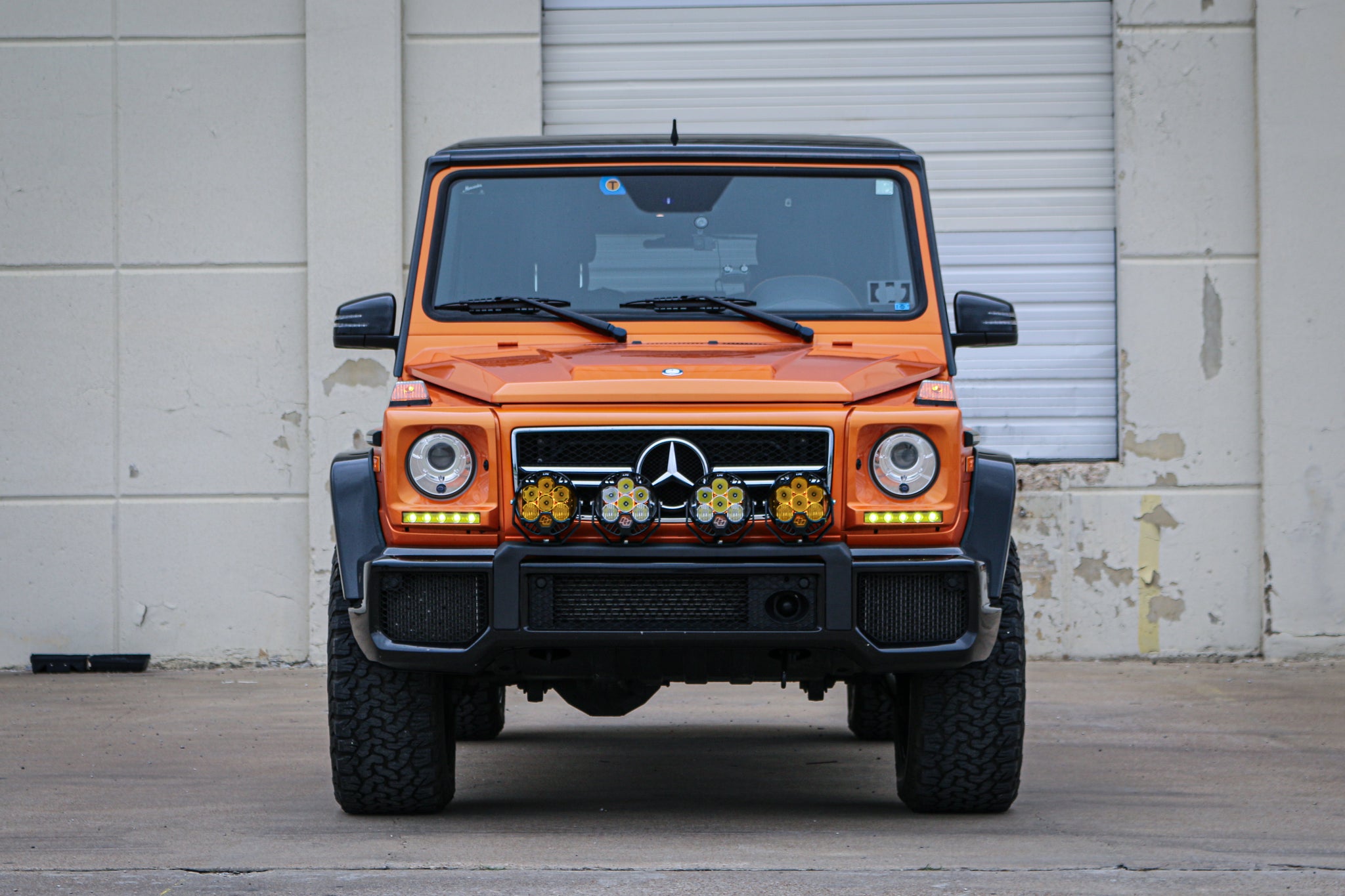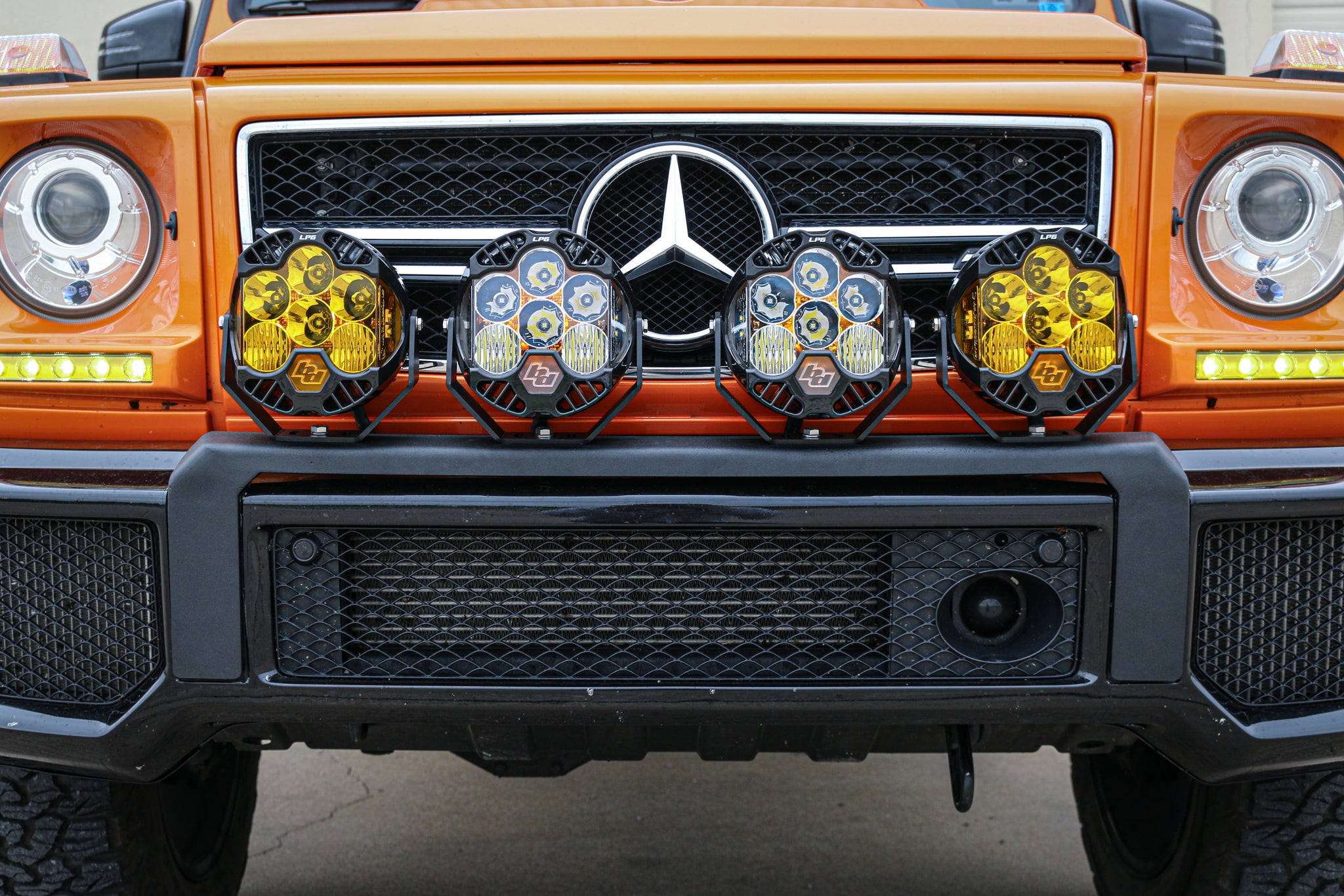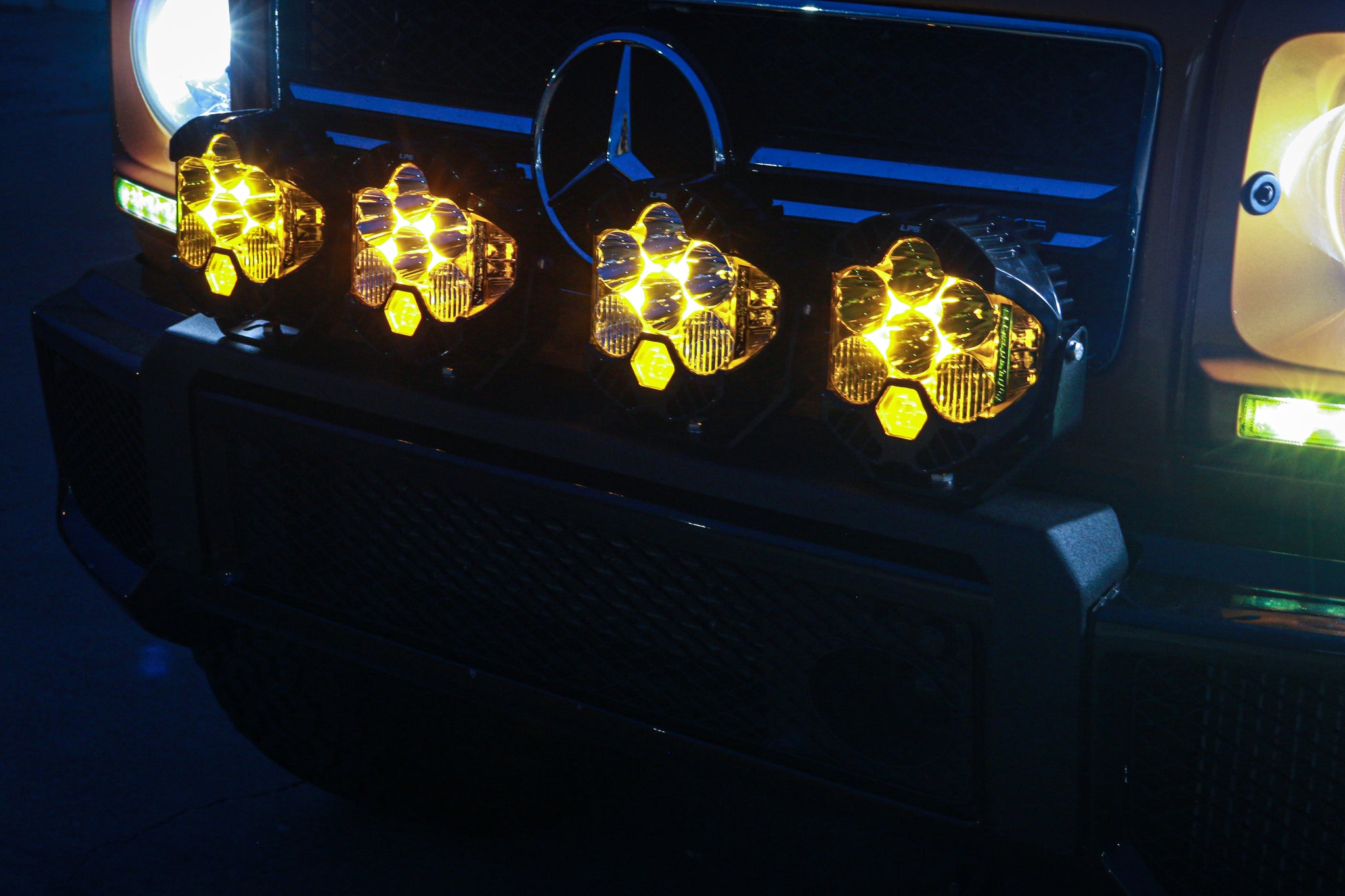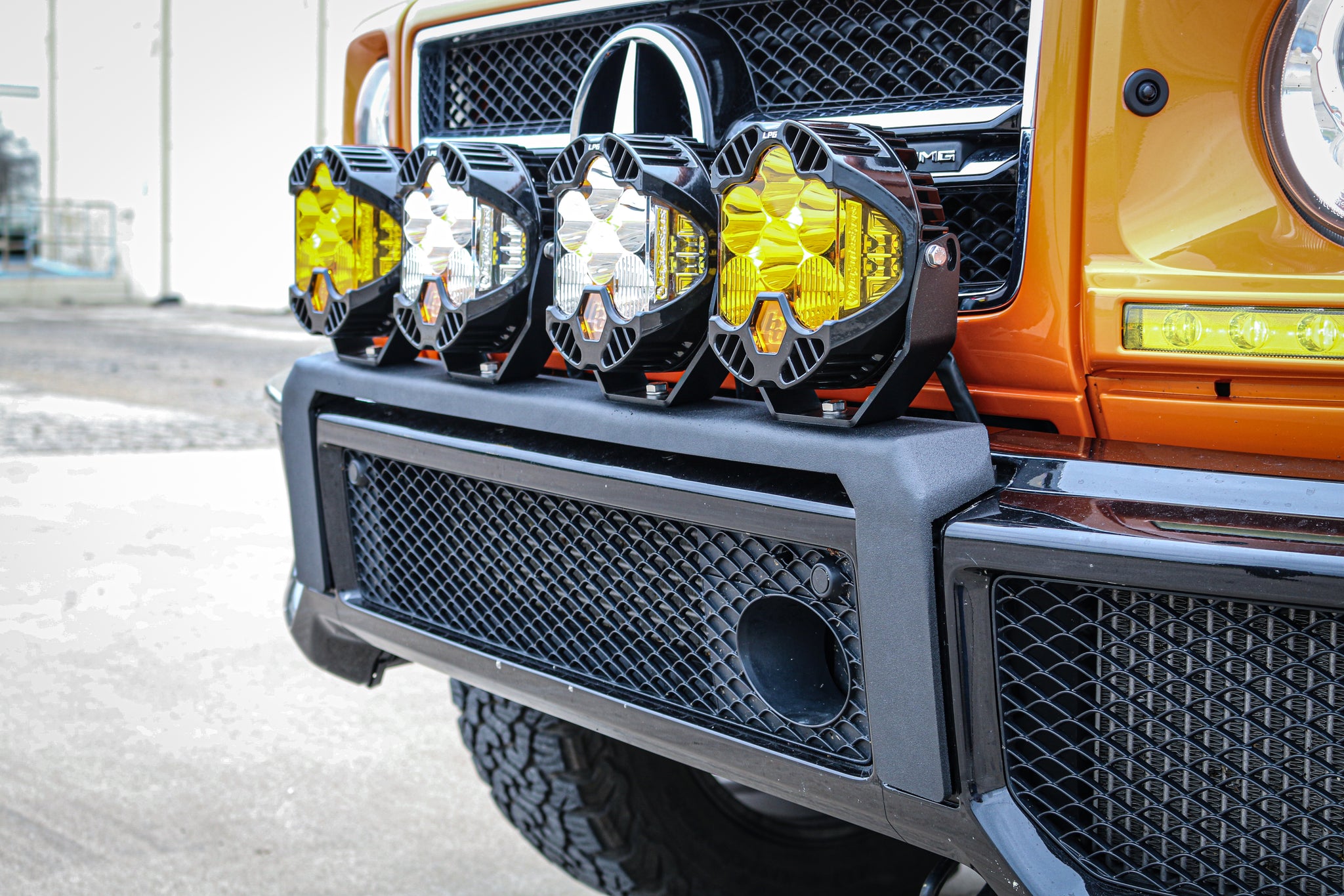 The JWO Front Bumper Light Bar Bracket fits seamlessly into the OEM G63 brush guard/bull bar mounting locations and requires no modification to the truck to fit. This light bar bracket allows you to run 4 pod lights across the front of your truck (pictured is 1 pair of Baja Designs LP6 Pro lights in clear and 1 pair of Baja Designs LP6 Pro lights in amber). We took special attention in this design on making a slightly wider gap between the two middle lights to allow for as much exposure of the MB star as possible.